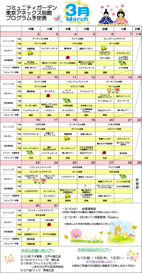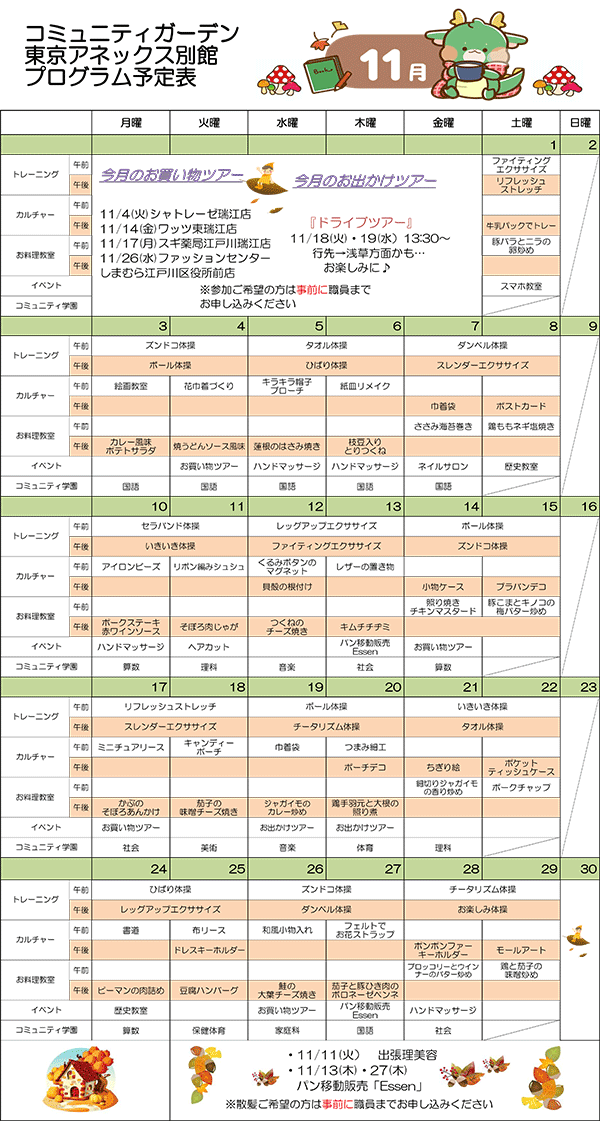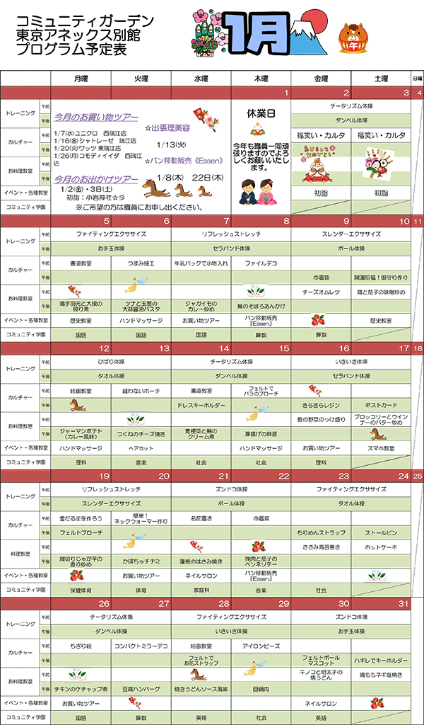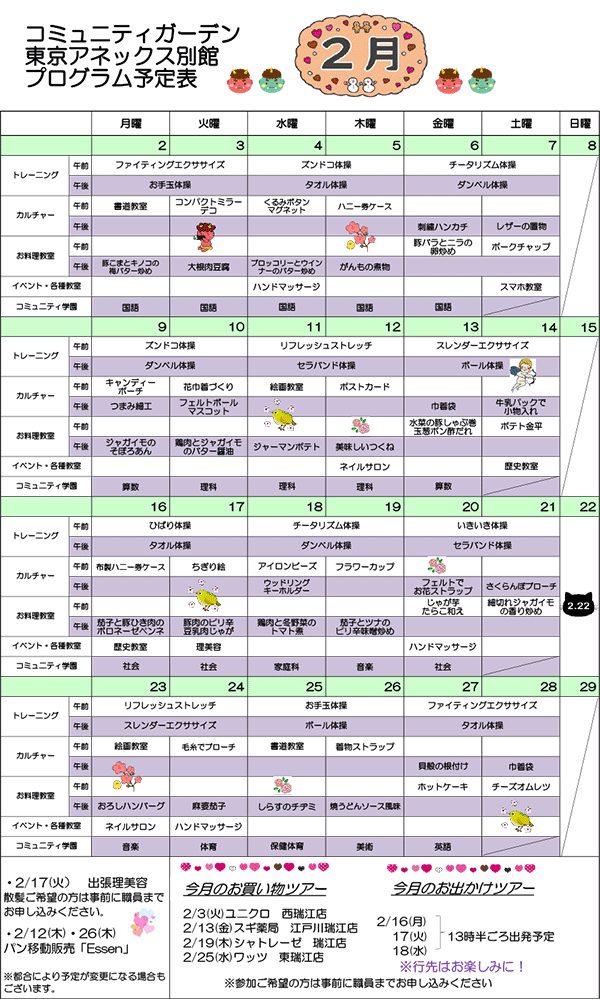 専門講師による陶芸や手工芸等のカルチャー教室の開催や、家庭料理からパン・お菓子まで幅広いメニューの料理教室を行います。