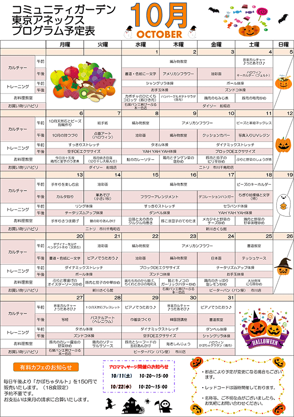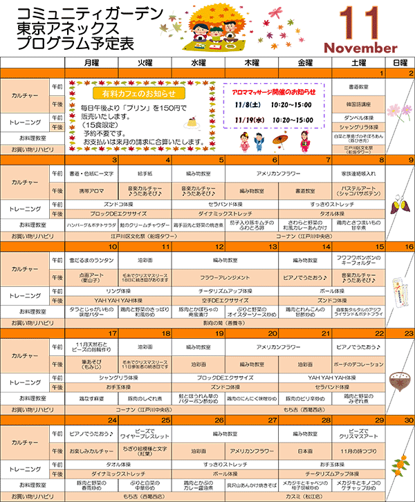 専門講師による陶芸や手工芸等のカルチャー教室の開催や、家庭料理からパン・お菓子まで幅広いメニューの料理教室を行います。