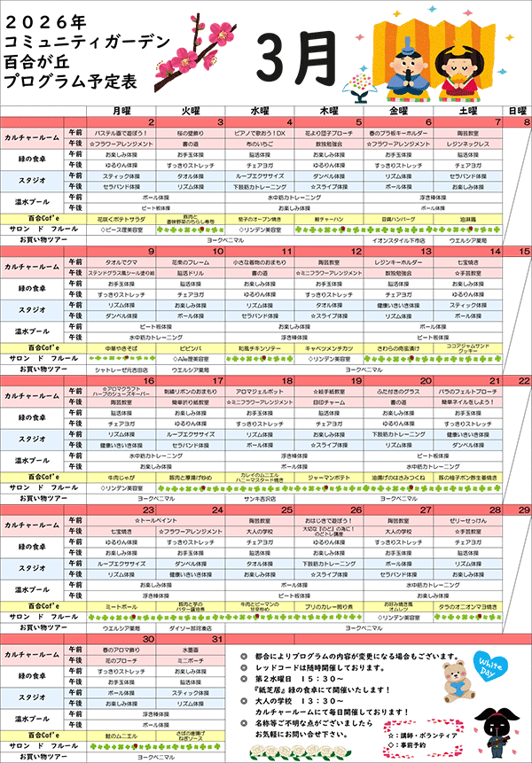 専門講師による陶芸や手工芸等のカルチャー教室の開催や、家庭料理からパン・お菓子まで幅広いメニューの料理教室を行います。