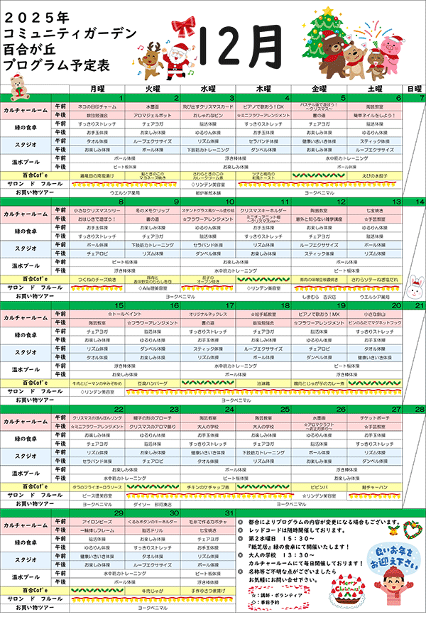 専門講師による陶芸や手工芸等のカルチャー教室の開催や、家庭料理からパン・お菓子まで幅広いメニューの料理教室を行います。